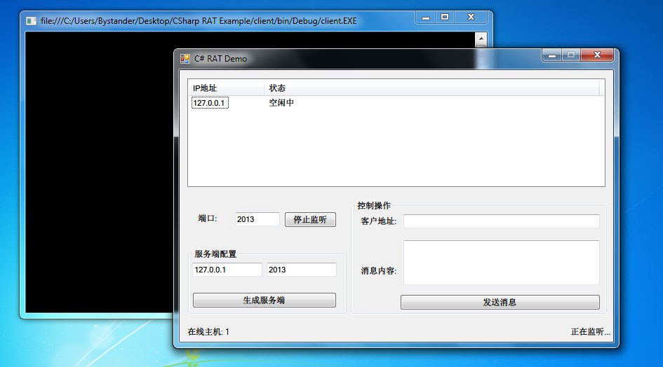 1.服务端,服务端通过ip和端口生成客户端之后,点击开始监听后,便开启监听线程持续监听,同时注册断开连接和收到信息的事件。收到来自TcpClient 流中的信息后,解析之,如果是连接信息,就添加到连接列表,这样服务端就可以显示多个客户端了。如果是断开信息,就删掉。如果服务端想要给客户端发消息,就选中该客户,然后填写信息,就会调用连接类的发送方法。