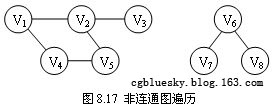 以上讨论的图的两种遍历方法都是相对于无向连通图的,它们都是从一个顶点出发就能访问到图中的所有顶点。若无向图是非连通图,则只能访问到初始点所在连通分量中的所有顶点,其他连通分量中的顶点是不可能访问到的(如图8.17所示)。为此需要从其他每个连通分量中选择初始点,分别进行遍历,才能够访问到图中的所有顶点,否则不能访问到所有顶点。为此同样需要再选初始点,继续进行遍历,直到图中的所有顶点都被访问过为止。