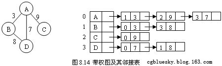 以上所讨论的邻接表所表示的都是不带权的图,如果要表示带权图,可以在表结点中增加一个存放权的字段,其效果如图8.14所示。
