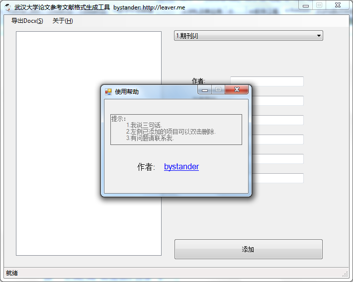 本工具生成的文献格式符合武汉大学本科生论文的格式要求,因此,放心使用,填写内容都是必填,页码什么的要是不知道就随便填一个..你懂的..有问题请留言反馈。