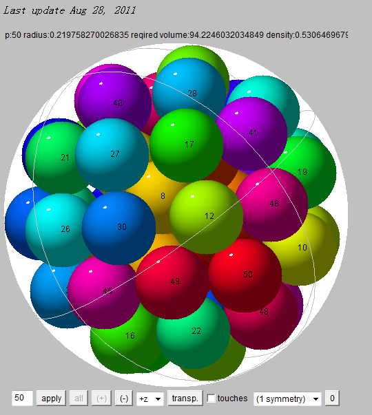 首先是stetson大学efriedma教授的网页,收集了各类填充(英文是packing)问题的图示,欢迎移步:packing center ,不过这里面恰好没有球体填充(SpherePacking)的问题,然后继续查找,进入了一个可以演示球体填充问题的页面:sphere packing demo 感谢网站作者Hugo Pfoertner,这里作者解出了1-72个球的问题,但是,作者说对于n>10的情况无法证明最优化.不过这个页面的演示太帅了,推荐看看。